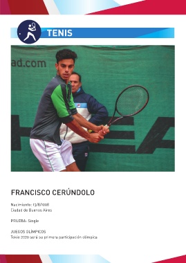 TENIS TENIS FRANCISCO CERÚNDOLO Nacimiento: 13/8/1998 Ciudad de Buenos Aires PRUEBA: Single JUEGOS OLÍMPICOS Tokio 2020 será su primera participación olímpica