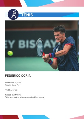 TENIS TENIS FEDERICO CORIA Nacimiento: 9/3/1992 Rosario, Santa Fe PRUEBA: Single JUEGOS OLÍMPICOS Tokio 2020 será su primera participación olímpica