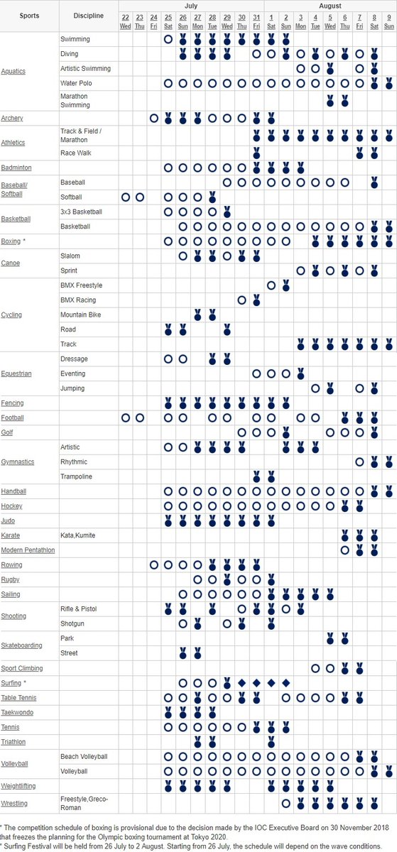 Las competencias de remo y tiro con arco comenzarán el mismo día de la inauguración (24 de julio). Por otro lado, el día de la Ceremonia de Clausura (9 de agosto) se llevará a cabo la maratón de hombres, mientras que el evento final de Tokio 2020 será la final masculina de waterpolo.